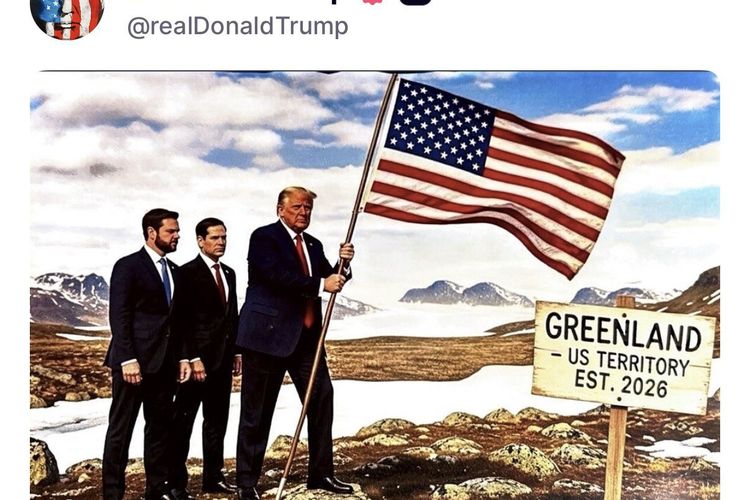 Dalam foto AI yang dibagikan pada Selasa (20/1/2026), Trump tampak menancapkan bendera Amerika Serikat di tanah Greenland. Ia didampingi oleh Wakil Presiden JD Vance dan Menteri Luar Negeri Marco Rubio. Di depan mereka, terdapat papan bertuliskan: “GREENLAND – US TERRITORY EST. 2026”.
